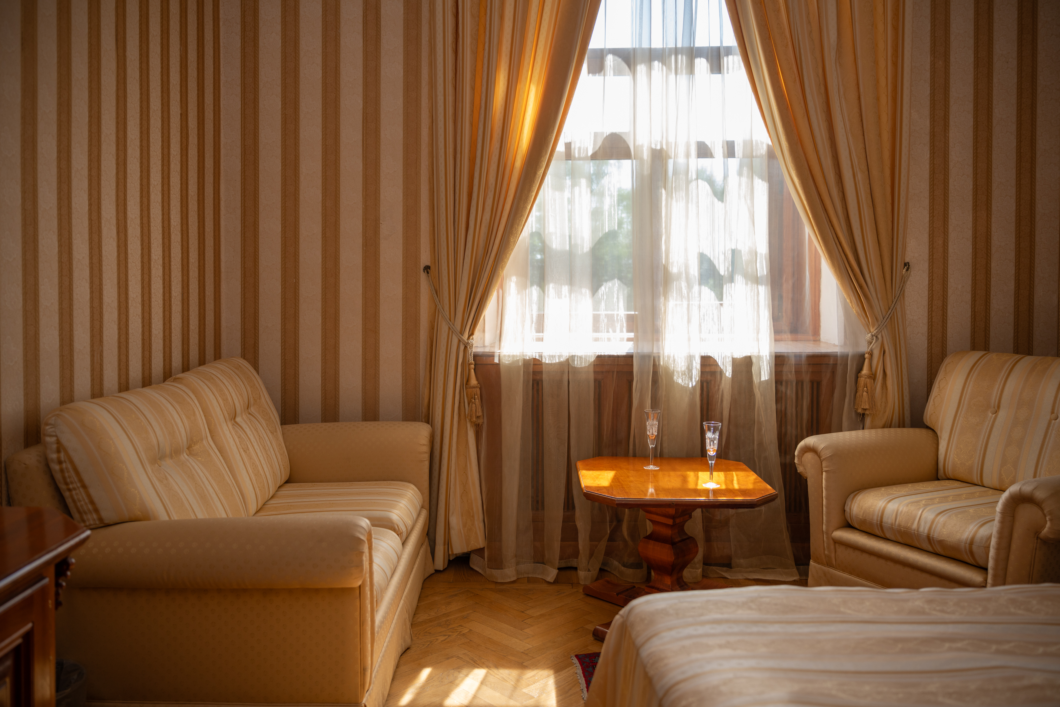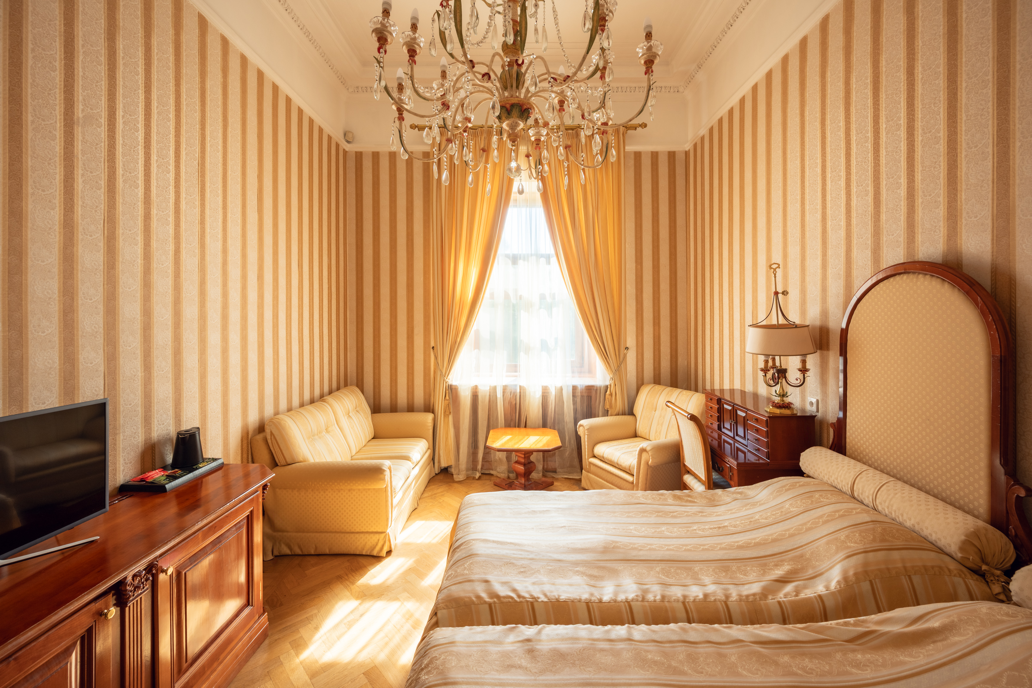 Сдержанный классический интерьер, паркетные полы, шелковые покрывала и портьеры и светлые тона создают атмосферу комфорта и спокойствия.